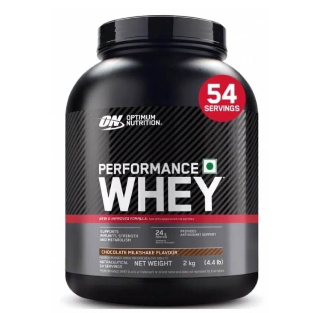 - ON Performance Whey Chocolate Milkshake – packed with 24g of high quality complete protein per serving to help build muscle. Advanced blend of ultra-filtered and concentrated all-whey protein.